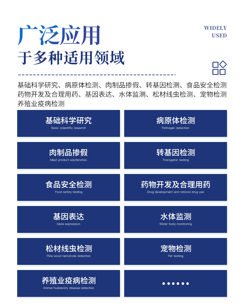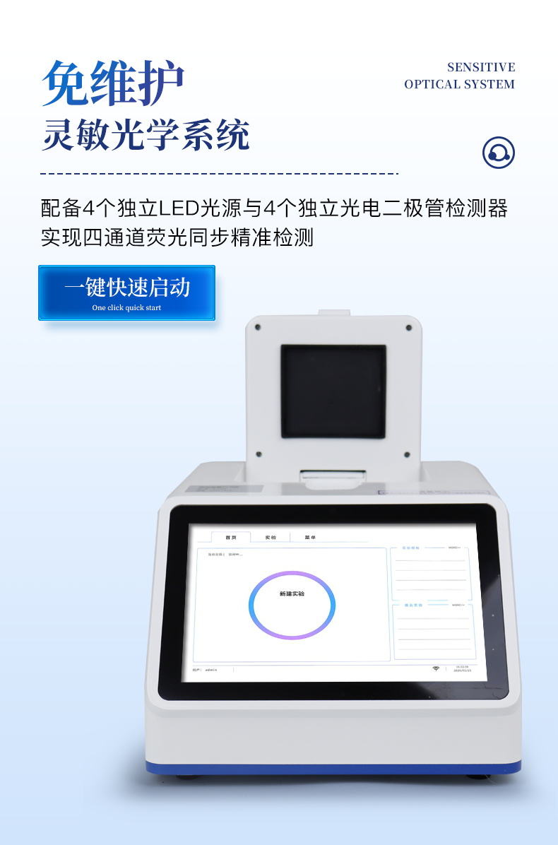 | 1.智能操作系统,实验尽在掌握 | A双模式灵活控制:支持通过仪器触摸屏独立运行,也支持通过电脑软件进行远程控制与数据管理,适应不同实验场景需求。 | B程序更新与预设:支持在线更新实验程序,并内置丰富的预设实验程序模板,用户亦可自定义保存常用模版,实现一键快速启动,极大提升操作效率。 | C极简启动体验(可选配):可定制集成摄像头扫描系统,用户只需扫描样品板或程序卡的二维码,即可自动识别并调用对应实验程序,简化流程,避免人为设置错误。 | D操作简单:无论是触摸屏界面还是电脑软件,均设计得直观易懂,新用户也能快速上手。预置常用程序模板,进一步简化操作流程。 | 2.精准稳定的温控与光学核心 | A长久精准的温控系统:采用进口***TEC半导体制冷模块,控温精准(±0.1°C),孔间温度均匀性**(≤±0.3°C)。系统稳定性卓越,长期使用性能衰减小,校准周期长达数年,显著降低维护成本与运营中断。 | B免维护的灵敏光学系统:配备4个独立LED光源与4个独立光电二极管检测器,实现四通道荧光同步精准检测。采用超长寿命进口光源,设计寿命期内免维护,无需额外校准或更换,保障检测结果长期一致性与高灵敏度。 | C卓越的数据质量:实验线性相关性高(R²≥0.999),重复性优异(孔间CV值低),确保定量结果准确可靠,数据置信度高 | 3.**便捷的数据与输出管理 | A多重数据导出方式:支持通过USB存储设备直接拷贝,或经由Wi-Fi无线网络传输数据至本地服务器或云端,方便灵活,满足各类实验室数据管理习惯。 | B丰富的报告导出与打印:支持生成并导出多种格式(如PDF、Excel)的实验报告。仪器兼容USB热敏打印机、蓝牙无线打印机及常规A4打印机,可直接在仪器上或通过电脑一键导出并打印专业报告,便于结果存档与即时分享。 | 4.快速**与坚固耐用 | A升降温速度快:优化设计的温控系统具备高速升降温能力,显著缩短单次循环与整体检测时间,提升实验通量。 | B超长使用寿命:核心部件均选用工业级耐用材料与设计,整机运行稳定可靠,致力于为用户提供长久的投资回报。 |