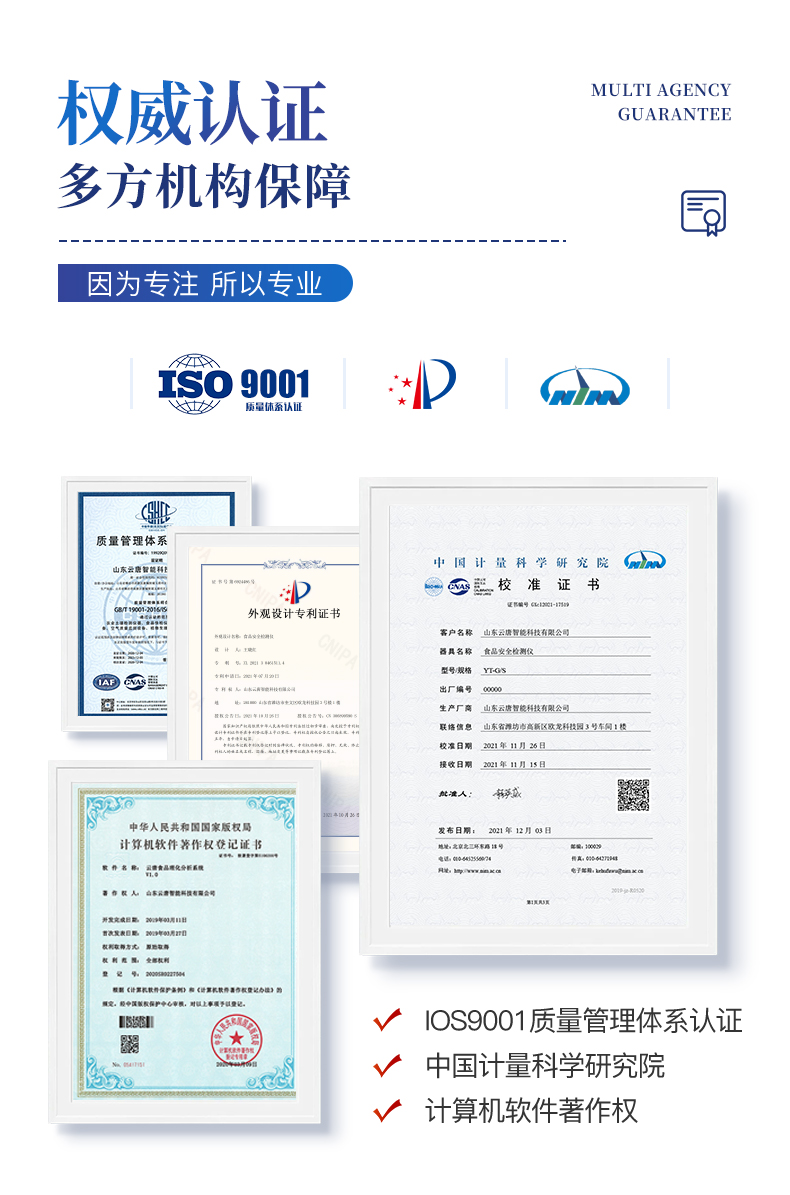 | 机箱采用工业级ABS工程塑料箱,方便携带,稳固耐用,便于流动测试。 | 安卓智能操作系统,采用更加**和人性化操作,仪器具有网线连接、wifi联网上传、4G无线远传功能,快速上传数据。 | 智能化程度高,仪器具有自检功能:具有开机自检和调零功能,具有自动检测重复性功能。 | 新一代高速热敏打印机,检测完成可自动打印检测报告和二维码。 | 仪器带有监管平台,数据可局域网和互联网数据上传,检测结果直接传至食品安全监管平台。进行区域食品安全监管及大数据分析处理与数据统计,检测区域食品安全长短期动态,达到食品安全问题预估、预警 | 一体化主机,包含食品安全检测模块、多通道农药残留检测模块、胶体金免疫层析检测模块。 | 一体化便携式快检设备,满足现场及流动检测使用需求,能够在同一软件下实现所有检测项目的检测,并可通过同一窗口直观显示检测结果。 | CT线自动识别,无需手动调整。 | 仪器具有品类多种类样品菜单库,可灵活选择检测样品,不同的检测通道可同时检测不同的样品项目。 | 样品处理简单省力,整体操作快速、安全、便捷。 | 仪器具有自身保护功能,可设置用户名及密码,防止非工作人员操作等。 | 高灵敏度,高检测精度,高重复性精度,扫描式高精度光学传感器。 | 内置强大的数据库,可在仪器上直接选择样品名称、检测指标、送检单位等信息,也可在仪器上直接编辑录入样品名称、检测指标、送检单位等信息并保存进样品数据库。 | 仪器具有重新校准、锁定、恢复出厂设置功能。 | 支持U盘存储。 结果判定线可修改,对照值标定值可保存,断电不丢失数据 | 兼容市场上所有的胶体金卡,使用耗材不受限制,极大增强用户使用体验。 |