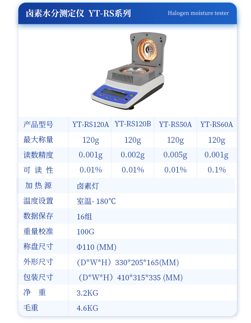 | 型号 :YT-RS120A,**称量值:120g ,显示分度值:0.001g,可 读 性 :0.01% | 型号 : YT-RS120B,**称量值:120g ,显示分度值: 0.002g ,可 读 性 :0.01% | 型号 : YT-RS50A,**称量值:120g ,显示分度值: 0.005g ,可 读 性 :0.01% | 型号 : YT-RS60A,**称量值:120g ,显示分度值: 0.01g ,可 读 性 :0.1% | 加 热 源 卤素灯 温度设置 室温- 180℃ | 数据保存 16组 重量校准 100g | 称盘尺寸 φ110 (mm) | 外形尺寸 (D*W*H)330*205*165(mm) | 包装尺寸 (D*W*H)410*315*335 (mm) | 净 重 3.2kg 毛 重 4.6kg |
