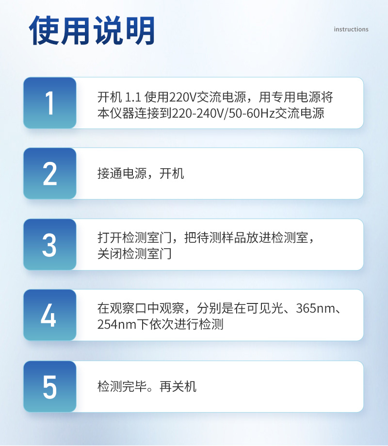 | 1、开机 1.1 使用220V交流电源,用专用电源将本仪器连接到220-240V/50-60Hz交流电源。 | 2、操作程序 | 2.1 接通电源,开机 | 2.2 打开检测室门,把待测样品放进检测室,关闭检测室门 | 2.3 在观察口中观察,分别是在可见光、365nm、254nm下依次进行检测。 | 2.4 检测完毕。再关机。 |
