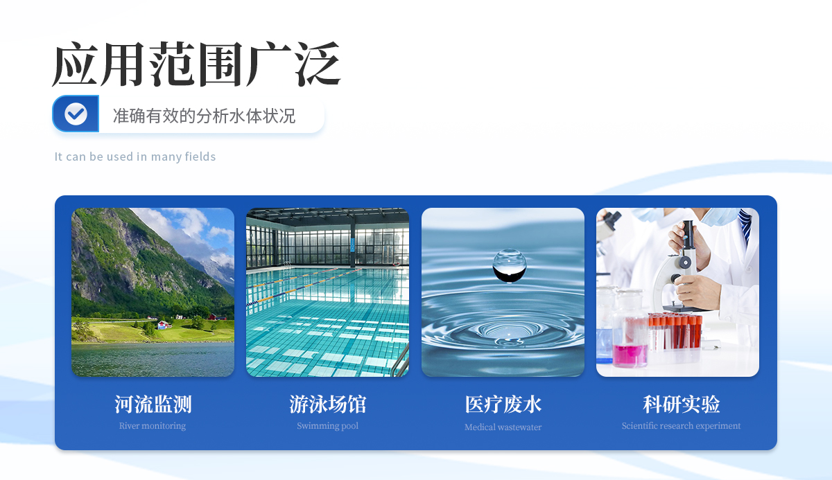 | 适用于饮用水、自来水、医疗废水、工业污水、河流监测、游泳场馆、水源保护、科研实验等。 |