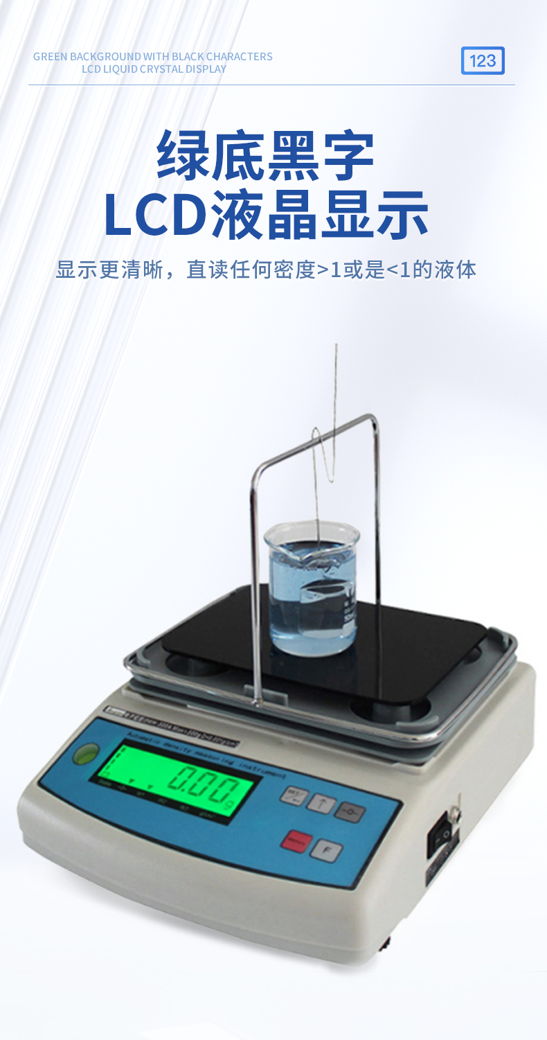 | 1、进入液体密度测试模式后,状态显示区显示“AIR”。 将挂钩悬挂在液体专用架正中央,按下“清零”键,扣除挂钩重量。 | 2、使用挂钩将标准的玻璃砝码钩起,稳定后,按“取样”键。确认玻璃砝码在空气中的重量时,显示“SAV-A”,表示已记录空气中的重量值。 | 3、此时状态显示区显示“LIq”。取下玻璃砝码。并取50ml待测液体样品到烧杯中,将玻璃砝码放入液体中。 | 4、将烧杯放在支撑板的正中央,使用挂钩将玻璃砝码钩起(确定测量液体有高于玻璃砝码,而且玻璃砝码不可以碰到烧杯壁),稳定后,按“取样”键。确认玻璃砝码在液体中的重量时,显示“SAV-B”,表示已记录液体中的重量值。 | 5、自动显示被测液体的密度值。按“模式”键,可切换显示样品的浓度值。 | 7、按“设置”键返回到待测状态,可进行下一组样品的测量。(连续测试时,要将挂钩及玻璃砝码清洁干净) | 仪器尺寸:195*220*190mm | 包装尺寸:430*200*360mm | 包装重量:4kg |