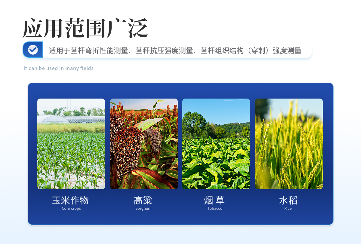 植物茎秆的强度是决定作物抗倒伏能力的一个主要因素,长期以来玉米,高梁、烟草等的倒伏给作物的机械收割造成很大的困难。从机械化水平来说,造成大量的粮食浪费。另外,作物倒伏导致光照不充分,使其生产量受到极大的限制。在作物生长的各个阶段对其茎秆进行活体测量,进而根据茎杆纤维层的抗弯阻力与抗倒伏能力的相关性对群体测量数据进行统计处理,对作物的栽培和育种具有重要意义。植物茎秆强度仪采用拉压力传感器,通过针刺、压碎、折断的方式测出茎秆断裂或者屈服瞬间产生的**力,即茎秆的强度