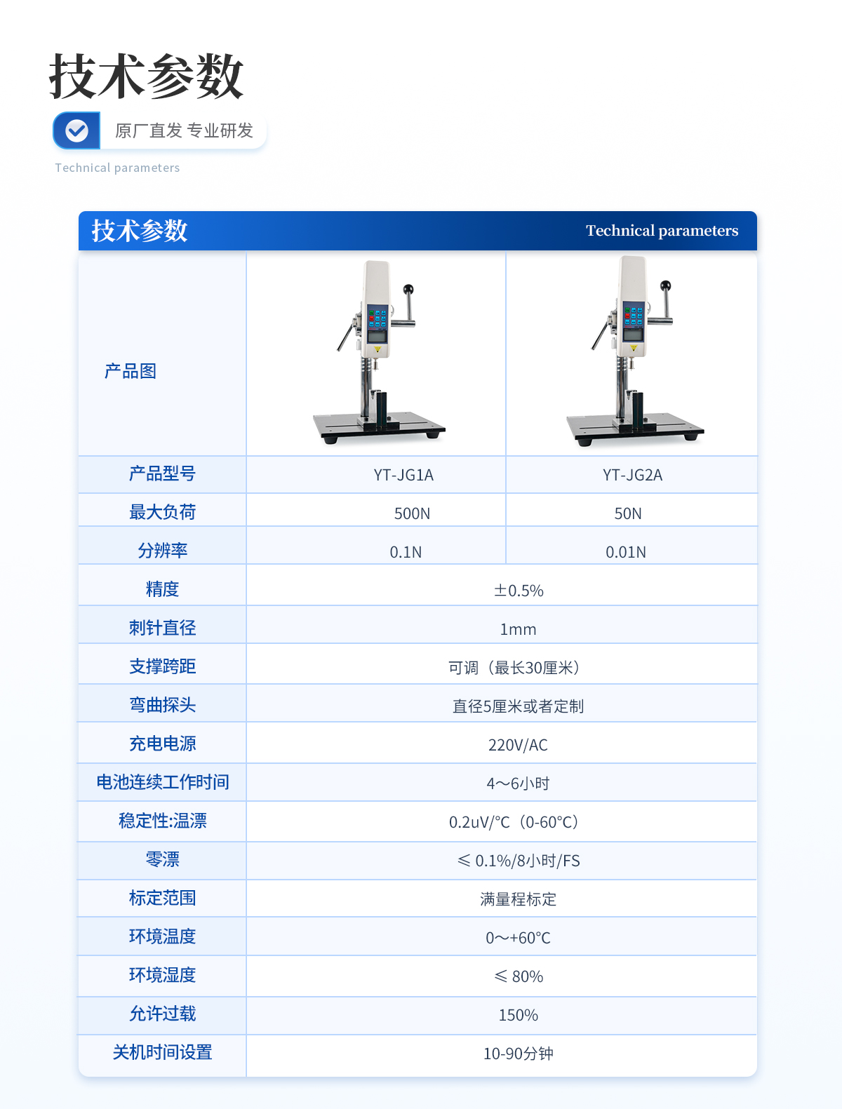 | **负荷:50N (其他量程可定制,N、Kg和ib三种单位可自动转换) | 分辨率:0.01N | 精度:±0.5%; | 刺针直径:1mm | 支撑跨距:可调(*长30厘米) | 弯曲探头:直径5厘米或者定制 | 充电电源:220V/AC; | 电池连续工作时间:4~6小时; | 稳定性:温漂:0.2uV/℃(0-60℃); | 零漂:≤ 0.1%/8小时/FS; | 标定范围:满量程标定; | 环境温度:0~+60℃; | 环境湿度:≤ 80%; | 允许过载:150%; | 关机时间设置:10-90分钟。 |